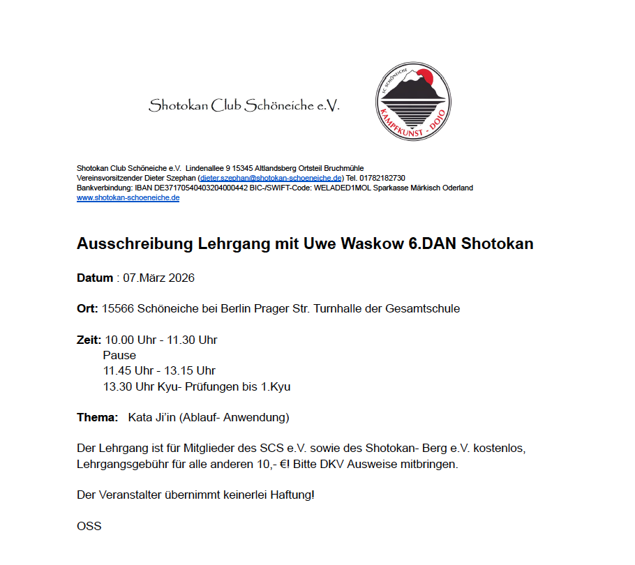 Am 11. Oktober 2025 richtete der Shotokan Club Schöneiche den 2. Gedenk-Lehrgang für unseren im vergangenen Jahr verstorbenen Freund und Weggefährten Ronald Dorau aus. Unter der Leitung von Dieter Szephan, dem neuen 1. Vorsitzenden des Vereins, vermittelte uns Sensei Uwe Waskow (6. DAN) die Kata Jion – sowohl in ihrer Form als auch in der Anwendung (Bunkai). Mit über 50 Teilnehmerinnen und Teilnehmern aus zahlreichen Vereinen Brandenburgs und Berlins war der Lehrgang nicht nur gut besucht, sondern auch ein voller Erfolg. Im Anschluss fanden Kyu-Prüfungen bis zum 1. Kyu statt, die alle Prüflinge mit Erfolg abschließen konnten.